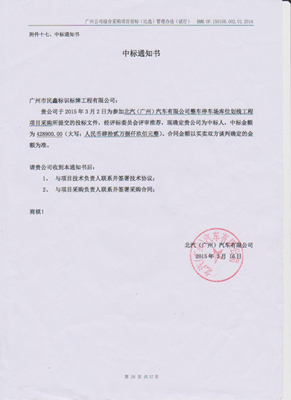 北汽(廣州)汽車有限公司整車停車場庫位劃線工程項目中標通知書